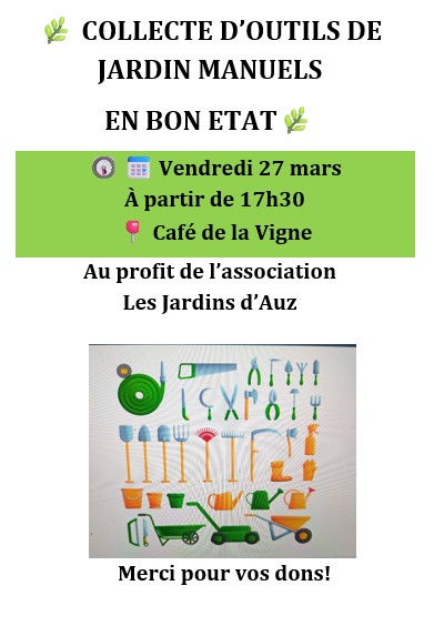 L’association « Les Jardins d’Auz’» a besoin de vous : afin d’outiller les jardiniers, une collecte est organisée au café de la Vigne ce vendredi à partir de 17 h 30. Tout outil en bon état leur sera utile !