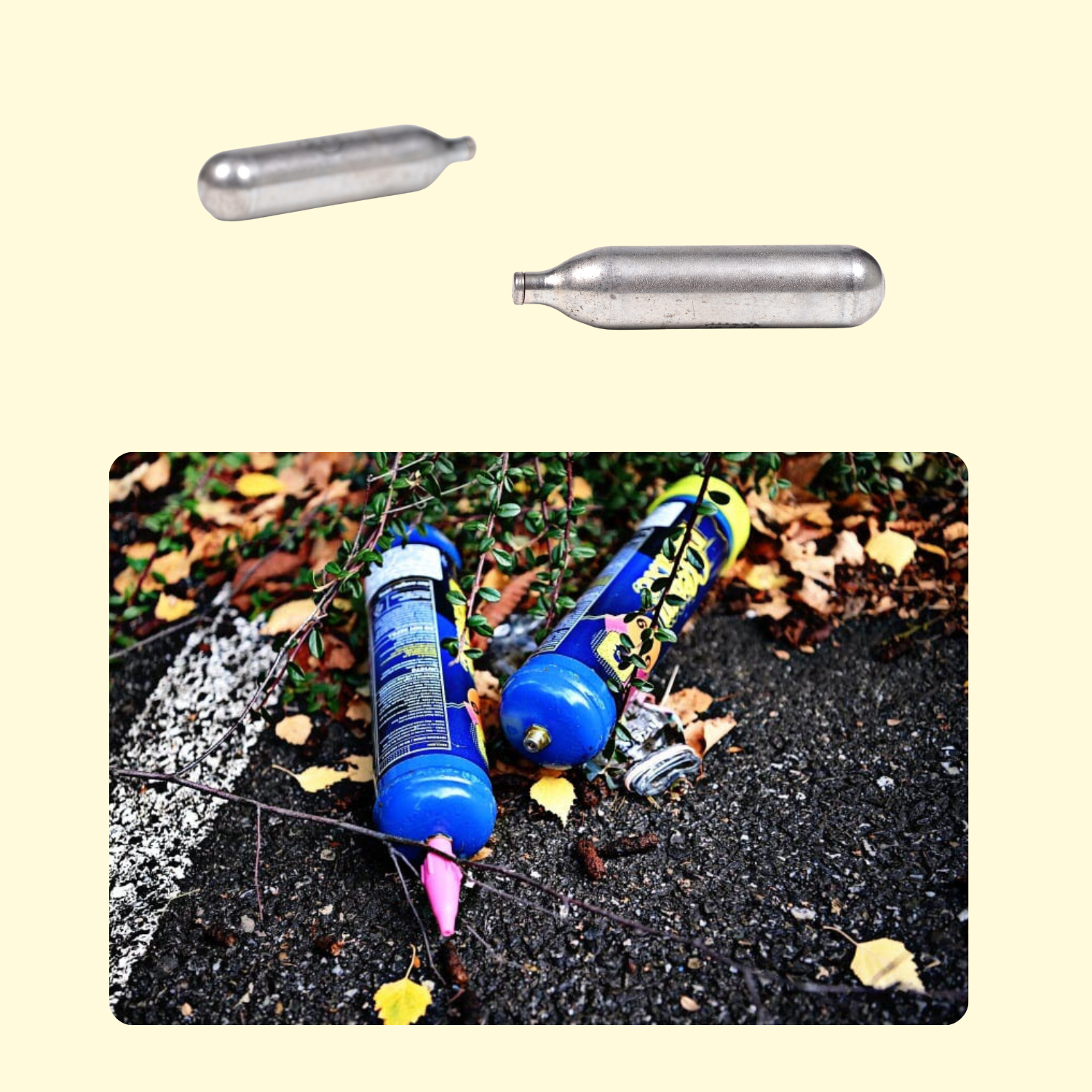 - en bas : dépôt sauvage de grandes cartouches bouteilles de protoxyde d’azote vides